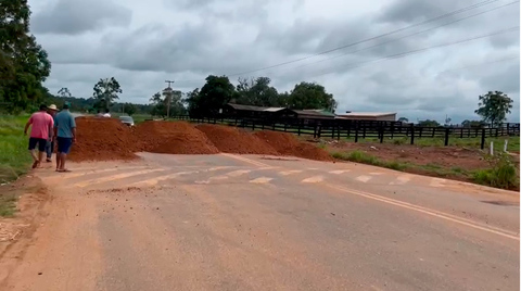 Manifestantes fecham a BR-425 com carradas de terra em Nova Mamoré
