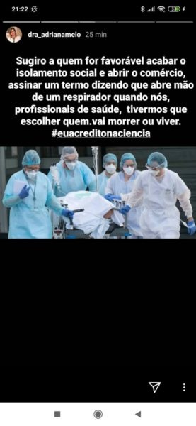 “Sugiro que quem for favorável acabar com o isolamento social e abrir o comercio, assinar um termo dizendo que abre mão de um respirador quando nós, profissionais da saúde, tivermos que escolher quem vai morrer ou viver”, disse a médica destacando que acredita na ciência.