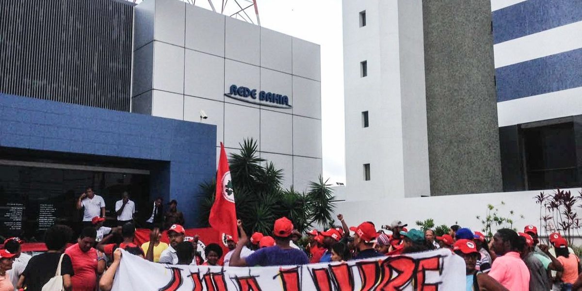 Cerca de 300 pessoas ligadas ao Movimento dos Trabalhadores Rurais Sem Terra (MST) e a Frente Povo Sem Medo ocuparam a sede da Rede Bahia, afiliada da Globo, em Salvador (BA); “Estamos fazendo esse dia de mobilização, denunciando o papel que a Globo tem tido, assim como teve no Golpe de 64 com a ditadura militar porque ela apoiou, ela publicizou, estimulou e ela tem feito coisa parecida agora, retirando diretos dos trabalhadores, estimulando a venda das riquezas do nosso país e estimulando a prisão do presidente Lula”, disse um dos MILITANTES, Vítor Alcântara