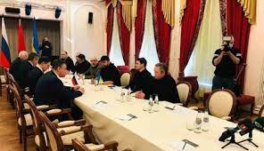 A delegação ucraniana se deslocou em dois helicópteros, conforme relatado pela agência russa Ria Novosti. Na manhã desta segunda-feira, o Ministério das Relações Exteriores da Bielorrússia publicou uma foto da sala para as negociações, anunciando que o local estava preparado.