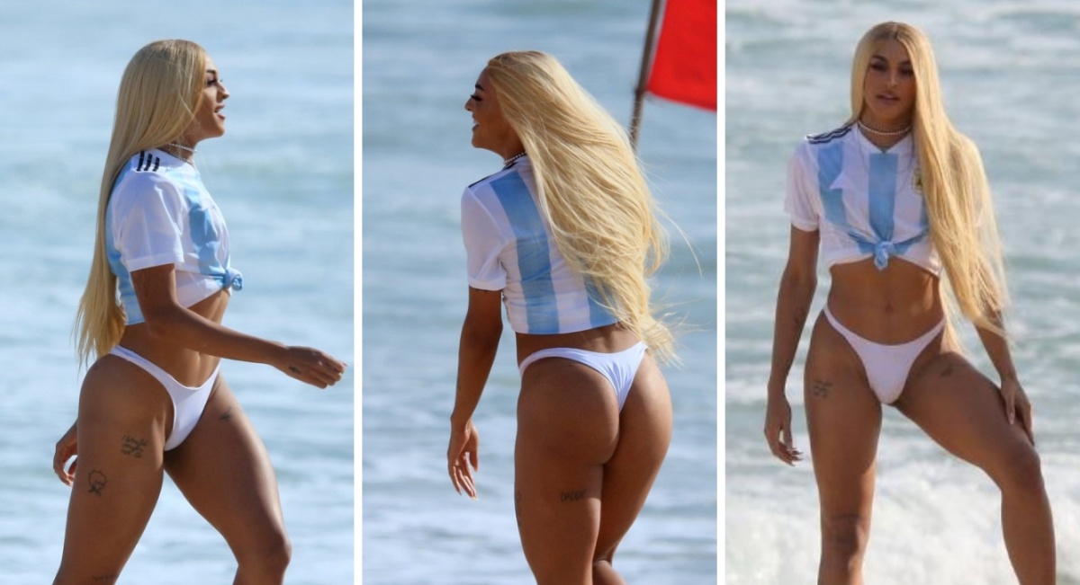 Pablo Vittar grava novo clipe em praia do Rio, usando apenas biquíni e uma camisa da Argentina.