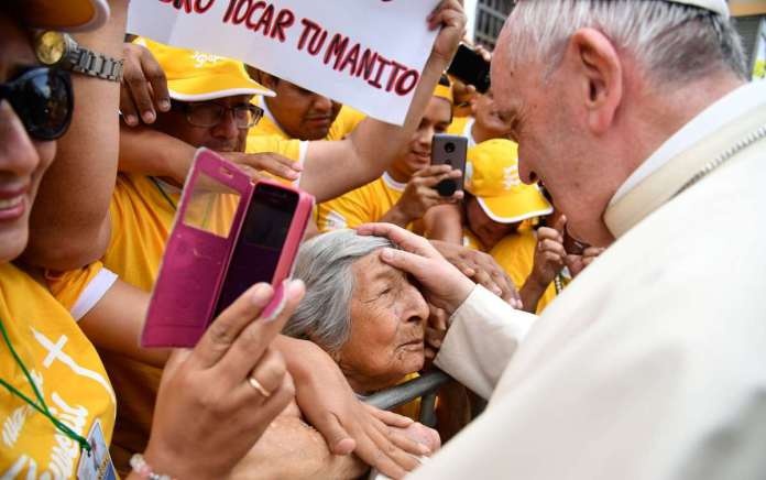 Papa desce do papamóvel para cumprimentar idosa cega de 99 anos no Peru