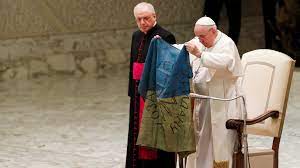 Papa mostra bandeira ucraniana vinda de Bucha: “Parem de semear morte”