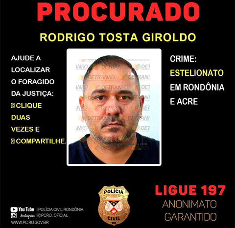 O advogado de Rondônia acusado de grandes golpes no estado e no Acre e alvo de mandado de prisão nesta terça-feira (20) é Rodrigo Tosta Giroldo.