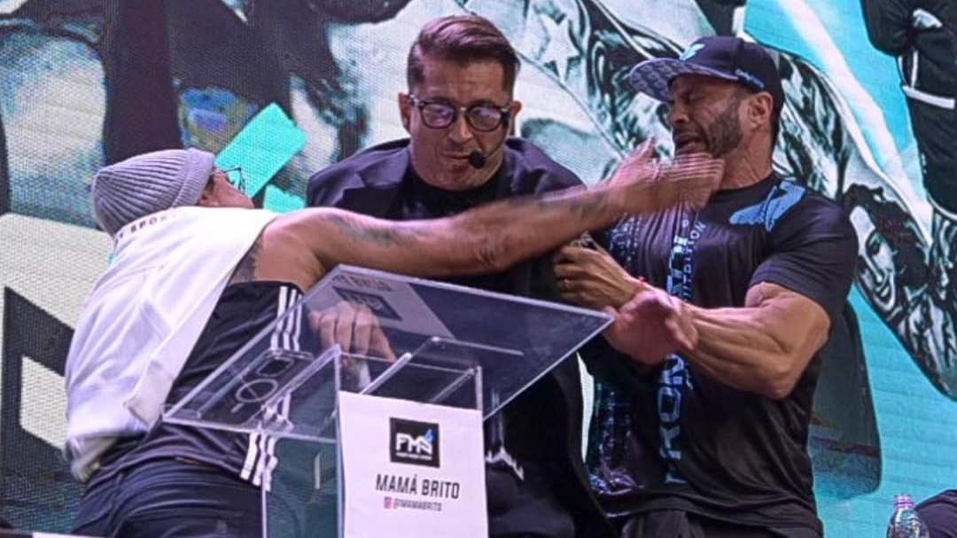 Na sequência, partiu pra cima do ex-BBB, e desferiu um soco em Bambam. Mamá Brito, presidente do FMS, estava no meio e quase foi atingido.