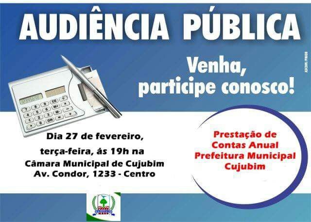 A Prefeitura Municipal de Cujubim realizara, no dia 27 de fevereiro, a Audiência Pública de Prestação de Contas do Município referente ao ano de 2017. O evento será realizado a partir das 19h00min, na Câmara Municipal de Cujubim situada na Avenida do Condor, 1233 – Centro, A Prefeitura convida todos os moradores e moradoras da cidade a participar do evento.