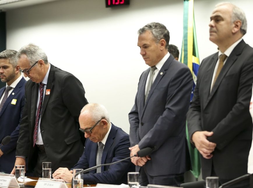 Durante 1 minuto de silêncio em homenagem às vítimas do rompimento da barragem em Brumadinho na Câmara dos Deputados, o presidente da Vale, Fabio Schvartsman, optou por olhar para baixo enquanto o resto dos presentes ficou em pé.
