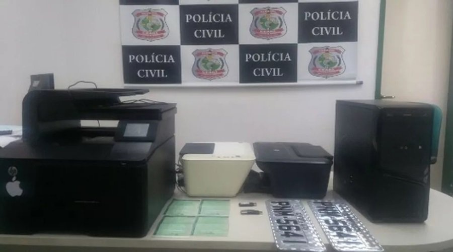A Polícia Civil informou nesta terça-feira (20) que prendeu dois homens suspeitos de clonar veículos e falsificar os documentos para comercializar os automóveis em Maracanaú, Região Metropolitana de Fortaleza. Um dos presos era monitorado por tornozeleira eletrônica e utilizava impressoras para falsificar documentos e placas na própria casa.