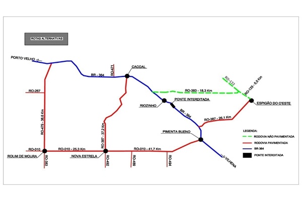 RONDÔNIA - No início da tarde da última quinta-feira (15), a Polícia Rodoviária Federal (PRF) divulgou um mapa, com rotas alternativas, para os motoristas que precisam transitar na região afetada pela interdição da Ponte sobre o rio Riozinho.