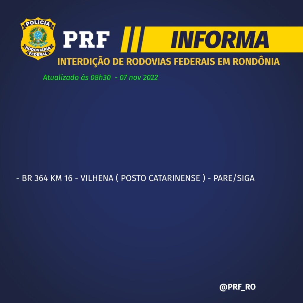 A PRF – Polícia Rodoviária Federal em Rondônia acaba de informar que o ponto de manifestação localizado no Posto Catarinense, na BR 364, no município de Vilhena, RO, está com trânsito lento, no formato de pare/siga.