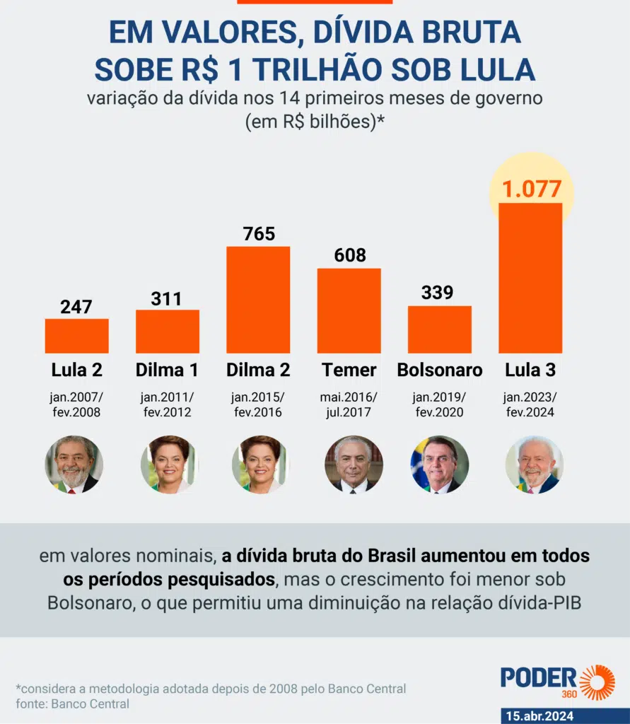 Comparando os primeiros 14 meses de cada governo, o atual governo superou o aumento da dívida observado no segundo mandato de Dilma Rousseff (PT), que foi de R$ 765 bilhões.