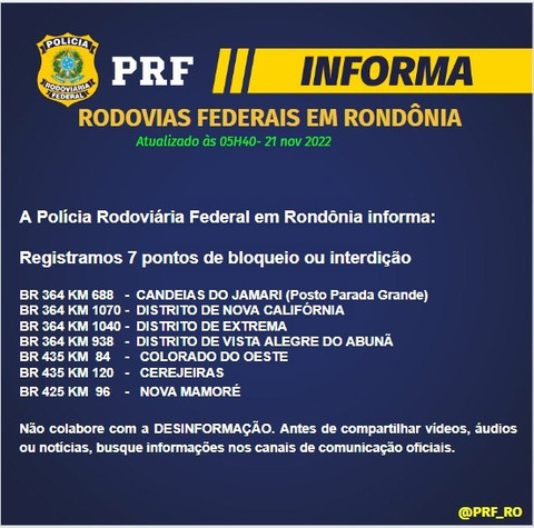 O último boletim da Polícia Rodoviária Federal (PRF) sobre o fechamento de rodovias em Rondônia, destaca que ainda existem sete pontos de bloqueio, quatro deles na BR-364, dois na BR-435 e um na BR-425.