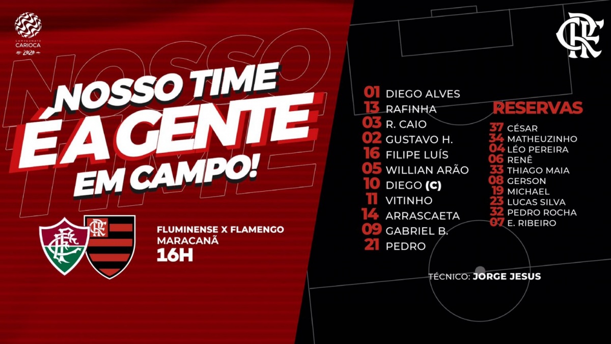Quatro dias após a final da Taça Rio, Flamengo e Fluminense vão se enfrentar de novo em partida válida pelo primeiro jogo da final do Campeonato Carioca. Em busca de mais uma vitória, o Mais Querido entrará no Maracanã às 16h (horário de Brasília), e você vai poder acompanhar o duelo pelo canal oficial do Tricolor, a FluTV. Como o Bruno Henrique é desfalque da partida, o Mister precisou mexer na equipe titular.