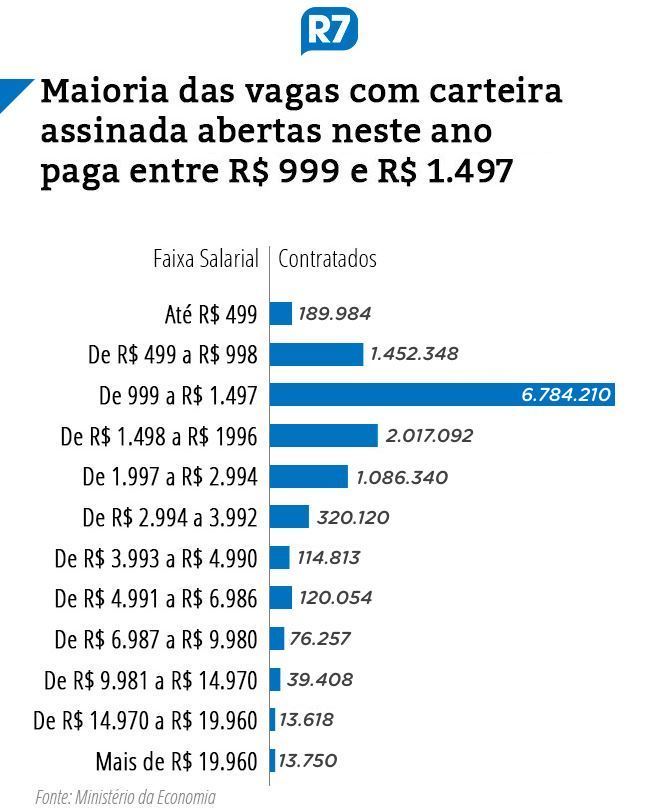 Sete de cada dez contratados em 2019 recebem menos de R$ 1.500