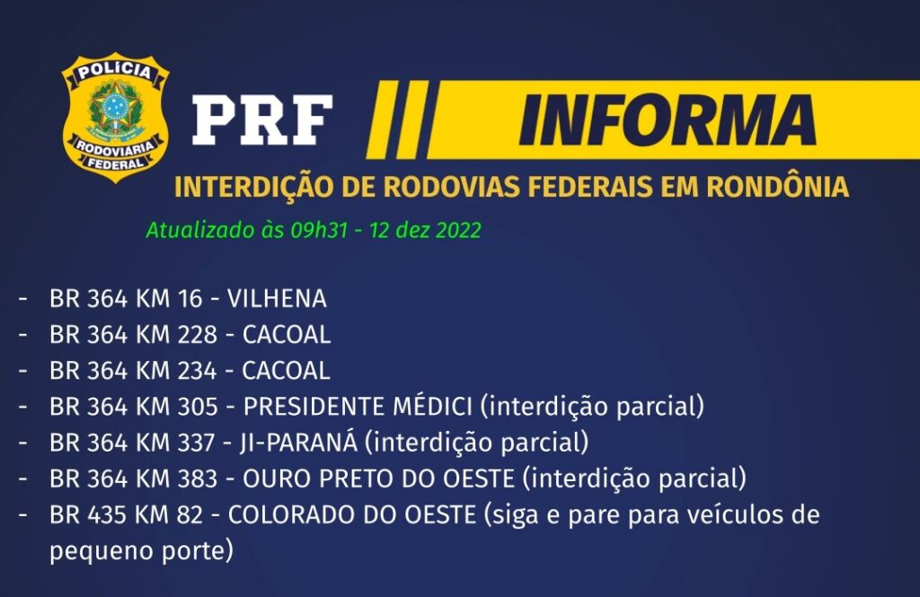 De acordo com o último boletim informativo divulgado pela PRF hoje, segunda-feira, 12, o número de bloqueio subiu para sete, além da BR 364 há registro de bloqueio na BR 435.