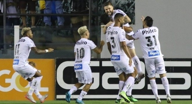 Jogadores do Santos comemoram gol marcado contra o Botafogo