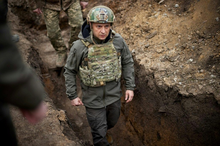 Imagem fornecida pelo serviço de imprensa da Presidência ucraniana em 9 de abril de 2021 mostra o presidente Volodymyr Zelensky no fronte na região de Mariupol - AFP