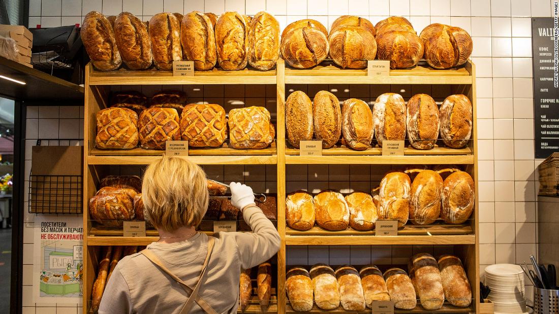 Fresh bread on a bakery stall inside Danilovsky market in Moscow, Russia, where food prices have shot up.