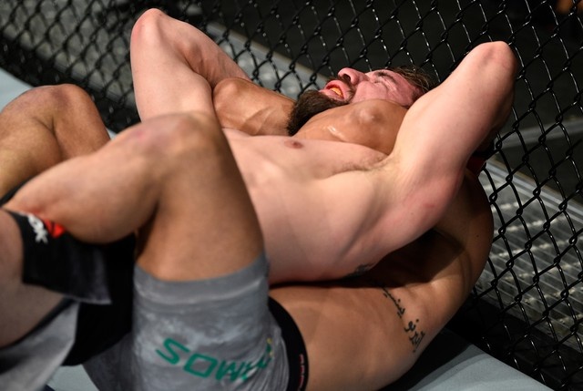 Brasileiro emplaca o mata-leão, adversário se desespera, mas não resiste (Foto: Getty Images)