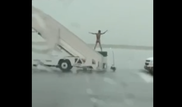 VÍDEO: Homem nu causa alvoroço ao descer de avião em meio a temporal