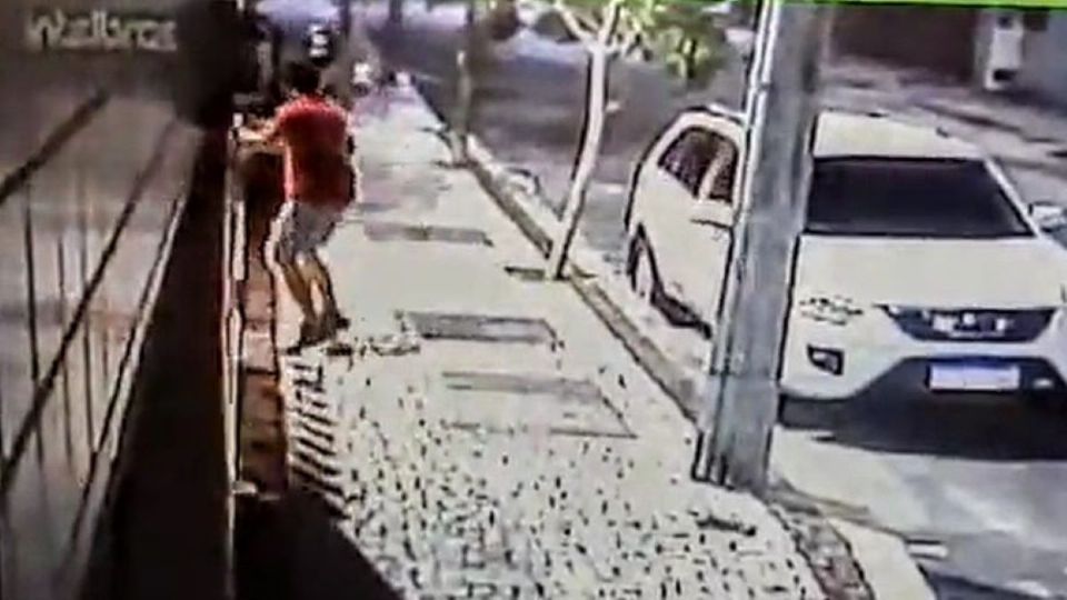 A vítima dispara correndo e desaparece no fim da rua, enquanto a dupla de ladrões tenta entender de onde veio o golpe e se restabelecer para fugir.