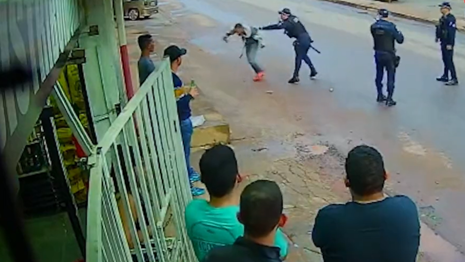 Mesmo rendido, com as mãos na cabeça, ele leva um tapa de um militar, enquanto o outro acompanha com a arma sacada. O responsável pela abordagem leva o homem para trás com um puxão e revista ele, dando mais um golpe, nos órgãos genitais do rapaz.