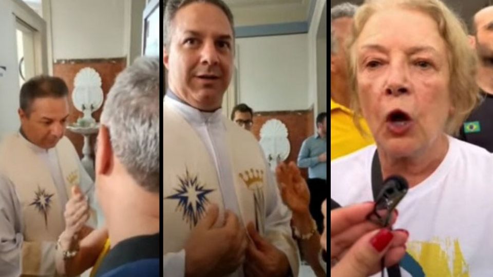 "Você viu o tumulto que está lá fora?”, indaga o padre, que foi alvo dos bolsonaristas por causa da homilia. Uma das mulheres diz que a polícia foi chamada.