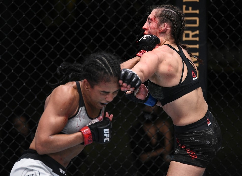 Viviane Araújo golpeia Montana de la Rosa em sua vitória no UFC Overeem x Sakai — Foto: Getty Images
