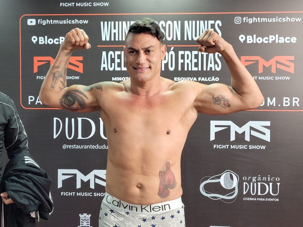 Whindersson Nunes e Acelino "Popó" Freitas confirmaram, na manhã deste sábado, na pesagem oficial do Fight Music Show, a luta principal que farão no domingo, em Balneário Camboriú (SC), no evento que mistura esporte e entretenimento. O humorista marcou 74,3kg, enquanto o tetracampeão mundial anotou 74,8kg.