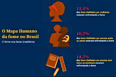 De acordo com pesquisa da Rede Brasileira de Pesquisa em Soberania e Segurança Alimentar e Nutricional, 19,1 milhões passaram fome num universo de 116,8 milhões que não tiveram acesso pleno e permanente à comida no final de 2020. Os famintos eram 9% da população, a maior taxa desde 2004.