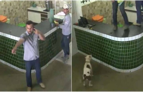 O vídeo, gravado pelo circuito interno do local na última semana, mostra o momento em que os homens ficam apavorados com a entrada do cachorro no local.
