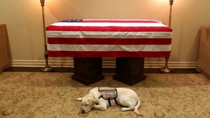 Cachorro que acompanhava George H.W. Bush é visto deitado ao lado do caixão