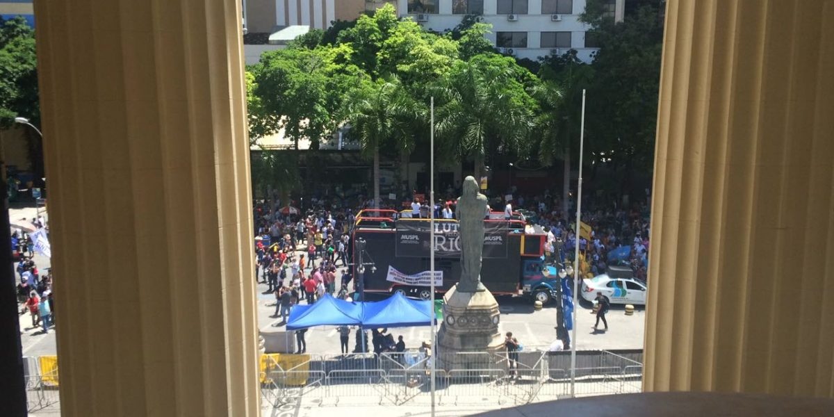 Os manifestantes ocupam a Avenida Primeiro de Março. Um carro de som, bandeiras de partidos de esquerda e de grupos sindicais também são usados no ato. Os discursos são feitos por líderes de movimentos e pessoas que se apresentam como “cidadãos comuns”. Todos pedem a manutenção da prisão de Jorge Picciani, Paulo Melo e Edson Albertassi, todos do PMDB. Os três passaram a noite confinados na Cadeia Pública José Frederico Marques, em Benfica, na zona norte do Rio.