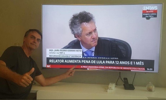 Menos discreto, Bolsonaro postou uma foto em que aparece na frente da TV comemorando a condenação quando o placar ainda estava dois a 0 contra o recurso apresentado pela defesa do petista. Na legenda, o parlamentar classificou a condenação como um “tiro de .50 na corrupção”, em referência ao tipo de munição de uma metralhadora de alto alcance.