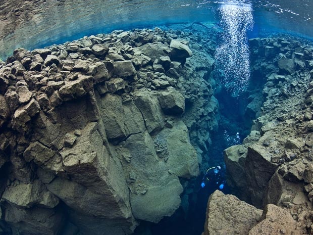 Esta é Silfra, na Islândia, uma fenda que separa as duas placas tectônicas abaixo da América do Norte e da Europa. Está localizada nas águas do lago Þingvallavatn (se vira aí pra ler) e é um destino bastante concorrido para mergulho