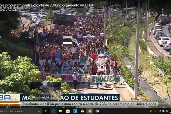 Estudantes, professores e integrantes de movimentos sociais realizaram um protesto, na manhã desta segunda-feira (6), em Salvador, contra o bloqueio de R$ 37,3 milhões em verbas da Universidade Federal da Bahia (UFBA), anunciado na última semana pelo Ministério da Educação (MEC).