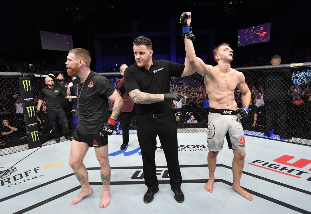 Dan Hooker é anunciado o vencedor contra Paul Felder da luta principal do UFC Auckland — Foto: Getty Images
