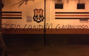 Isso porque, quem quiser assistir ao jogo deste final de semana, terá que pagar R$ 10, residentes no Brasil, ou 8 dólares, rubro-negros que moram no exterior. Com isso, os muros da Gávea amanheceram pichados neste sábado (04), com os seguintes dizeres: “Fora, Landim. Ganancioso” e “O Flamengo é do povo“. A ação é em forma de protesto à atitude da diretoria do Fla. A informação foi divulgada primeiramente pelo jornalista Marcos Coelho, da rádio Tupi.