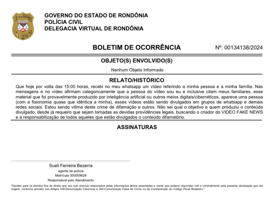“Estou sendo vítima deste crime de difamação e outros. Não sei qual o objetivo e quem produziu o conteúdo divulgado. Desde já requeiro que sejam tomadas as devidas providências legais, buscando o criador do vídeo fake news e a responsabilização de todos aqueles que estão divulgando o conteúdo difamatório”, pediu a vítima.