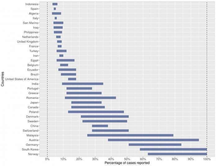 Estimar a porcentagem de casos sintomáticos de COVID-19 relatados em diferentes países usando estimativas da taxa de mortalidade de casos com base em dados do ECDC, corrigindo os atrasos entre a confirmação e a morte.