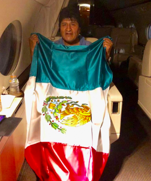 Evo Morales embarcou para o México, em avião da Força Aérea daquele país, com uma bandeira da Bolívia. Antes disso, ele postou no Twitter: