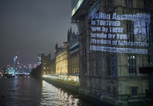 Seguem imagens projetadas pelo grupo em Londres, palco de campanha pela liberdade do fundador do WikiLeakes.
