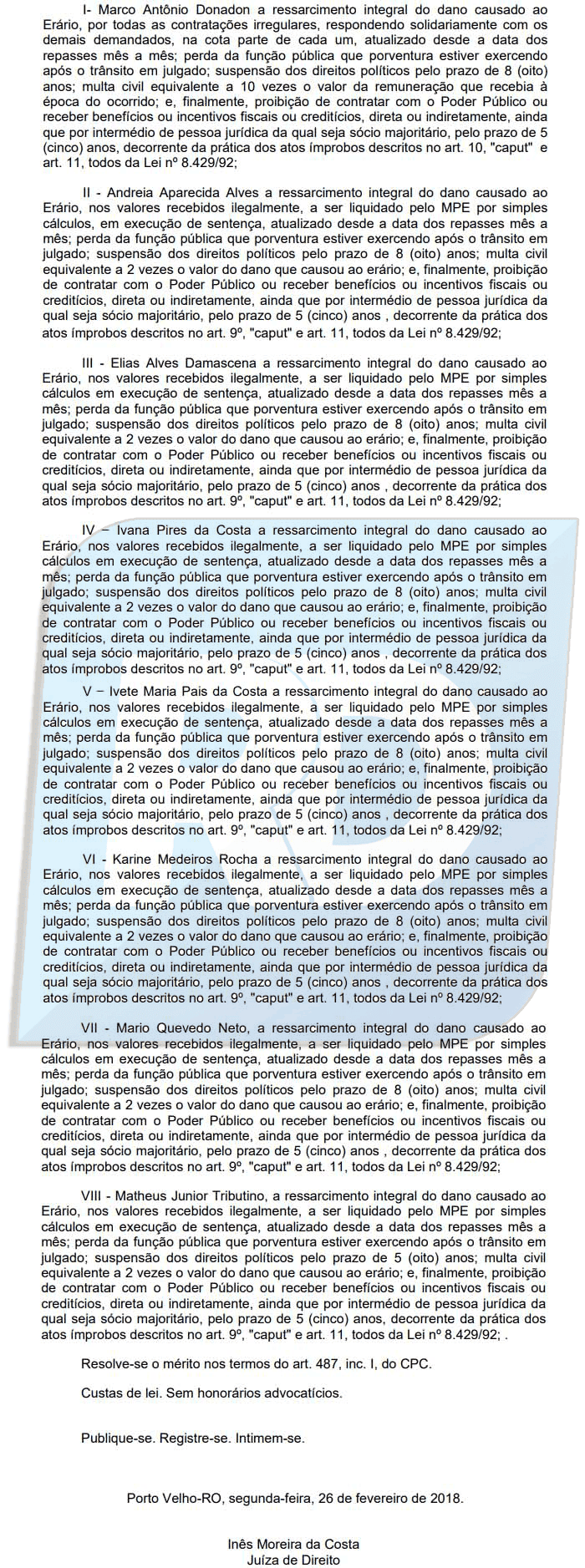 Porto Velho, RO – A juíza de Direito Inês Moreira da Costa, da 1ª Vara da Fazenda Pública, condenou o ex-presidente da Assembleia Legislativa (ALE/RO) Marcos Donadon e outros setes réus por contratações irregulares e ocupações de cargos comissionados por servidores “fantasmas”.