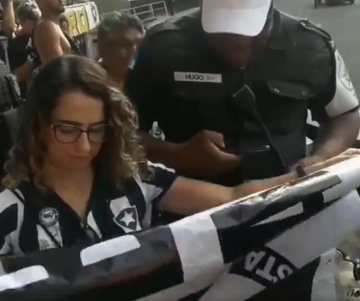 Durante a disputa entre Botafogo e Ceará neste domingo (8), no estádio Nilton Santos, no Rio de Janeiro, policiais removeram faixa de uma torcedora que dizia “Botafogo Antifascismo”. O vídeo foi compartilhad pelo youtuber Felipe Neto em suas redes sociais.