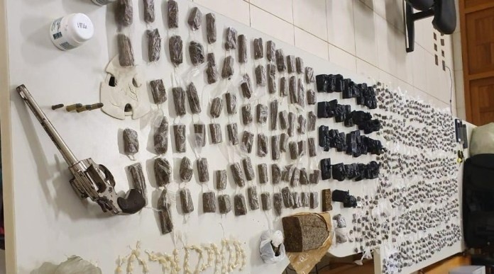 A Força Tática da Polícia Militar apreendeu na noite desta terça-feira (3), grande quantidade de entorpecentes, no Córrego do Laje, zona rural de Iúna. Na casa, que funcionava como ‘boca de fumo’, foram encontrados 843 buchas de maconha, 145 pedras de crack, 2,250 quilos de maconha dividido em pedaços, um tablete de 750 gramas da mesma droga, 50 gramas de crack, 15 pinos de cocaína, uma arma, munições e um colete balístico.