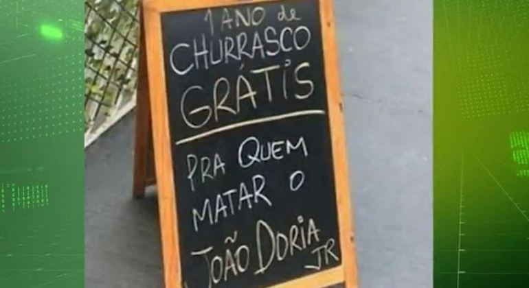 Um comerciante de 40 anos foi conduzido à delegacia depois de fazer uma ameaça ao governador de São Paulo, João Doria (PSDB). Ele colocou uma placa na frente do restaurante e oferecia um ano de churrasco grátis para quem matasse Doria.