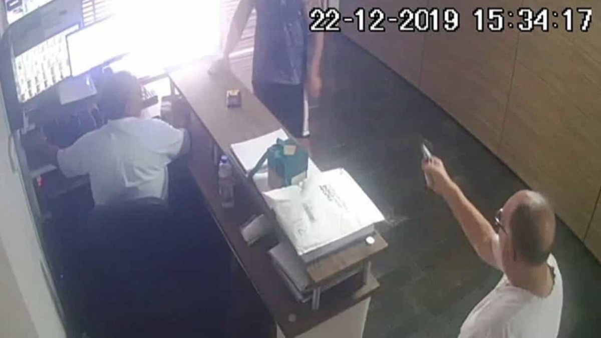 SÃO PAULO, SP (FOLHAPRESS) - Imagens de câmeras de monitoramento mostram o momento em que um idoso de 89 anos atira três vezes, com um revólver, contra um assistente administrativo de 33 anos, no hall do prédio onde ambos moram, no último dia 22 na região da República (centro da capital paulista). A vítima foi ferida na boca e não corre risco de morrer.
