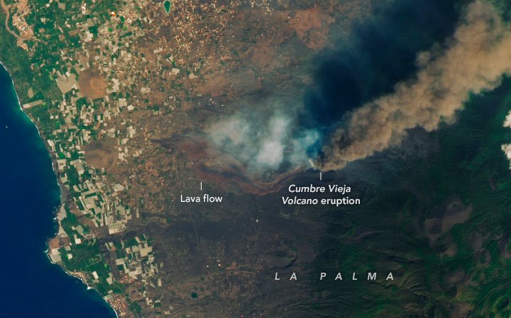Um dos satélites da Agência Espacial dos Estados Unidos (Nasa) registrou no último domingo, 26, imagens do rastro da lava do vulcão Cumbre Vieja, nas Ilhas Canárias. O material vulcânico, que avança pela ilha desde o último domingo, 19, atingiu o oceano Atlântico nas últimas horas desta terça-feira, 28. Imagens em cores reais captadas pelo Landsat 8 mostram a lava fluindo pelas comunidades de El Paraiso e Todoque. Segundo a Nasa, embora o material estivesse quente e derretido, ao entrar em contato com a superfície, ele deixou uma crosta escura que fez o fluxo da lava parecer preto.