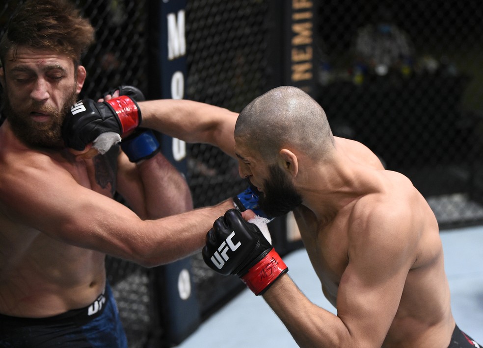 Khamzat Chimaev nocauteou Gerald Meerschaert em 17s no UFC Covington x Woodley — Foto: Getty Images