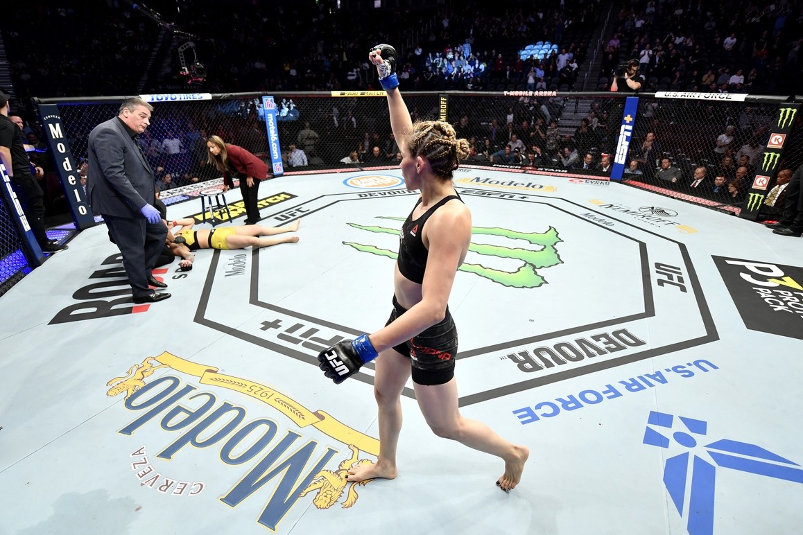 Irene Aldana dá os golpes finais em Ketlen Vieira, e Jason Herzog entra no meio para encerrar a luta — Foto: Jeff Bottari/Getty Images